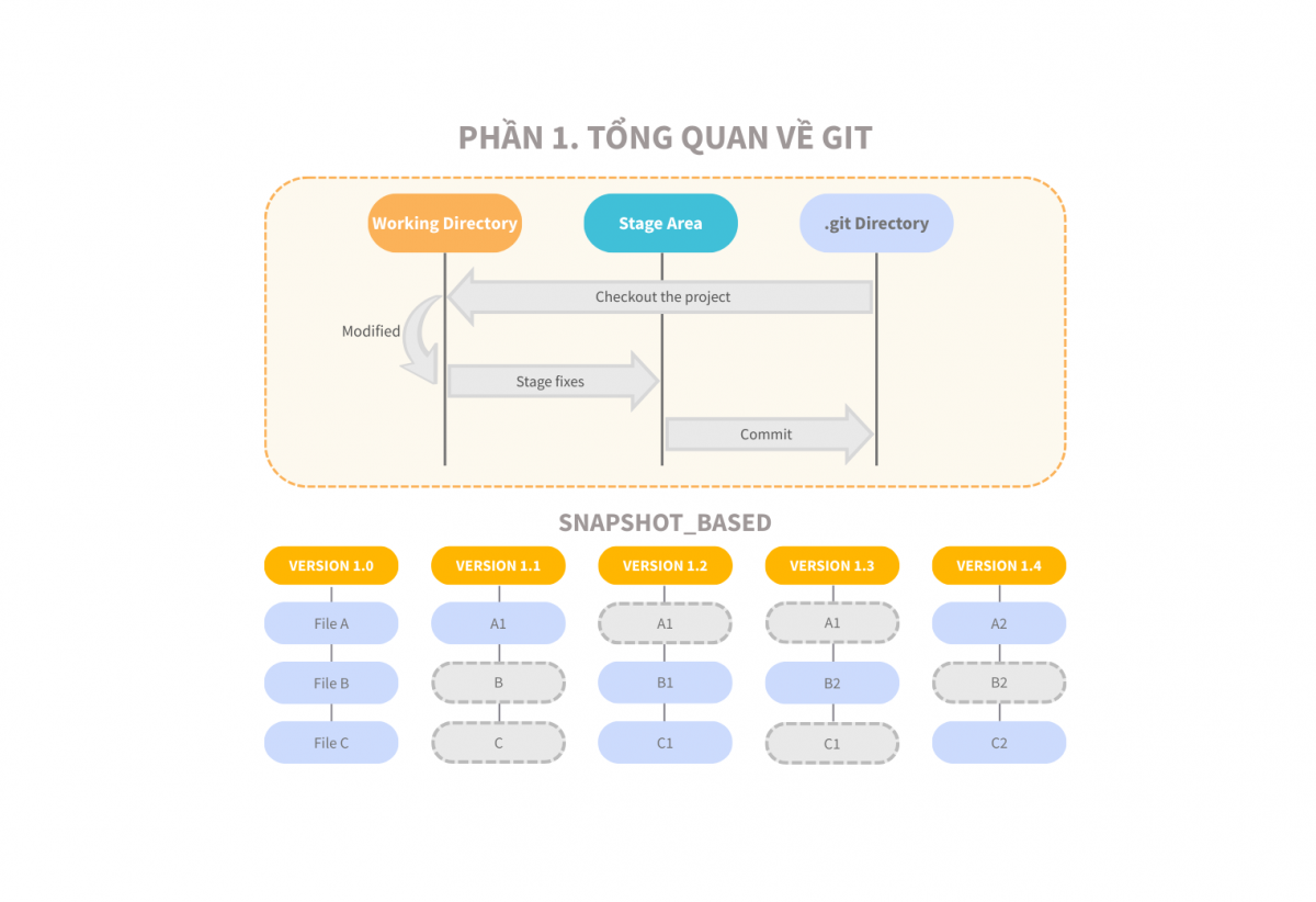 - Snapshot_based (Git): mỗi khi người dùng commit (cam kết các thay đổi), Git sẽ chụp “bức ảnh” toàn bộ (snapshot) về trạng thái của tất cả các tệp trong dự án tại thời điểm đó. Để tối ưu hiệu suất, nếu một tệp không thay đổi, Git sẽ không lưu trữ lại tệp đó mà chỉ tạo một tham chiếu đến bản sao đã lưu trước đó. Các bạn xem hình 4 để hiểu rõ sự khác nhau giữa Git và các VCS khác nhé!