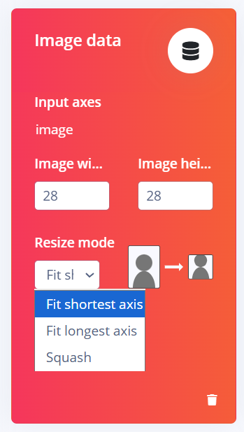 Đầu tiên ta setting Image data bằng cách đặt lại size và chọn resize mode, trong dự án này thì chúng tôi chọn size 28×28 pixels và fit shortest axis.