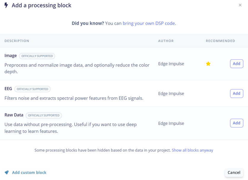 Add a processing block trong quá trình thiết kế Impulse của Edge Impulse, nơi người dùng xác định cách dữ liệu ảnh sẽ được xử lý trước khi đưa vào mô hình huấn luyện. Trong project training ảnh, khối Image được lựa chọn vì đây là khối xử lý chuyên biệt cho dữ liệu hình ảnh và được hệ thống khuyến nghị. Khối này có nhiệm vụ tiền xử lý ảnh như chuẩn hóa giá trị pixel, thay đổi kích thước ảnh về cùng một chuẩn và tối ưu dữ liệu đầu vào, giúp giảm sự khác biệt giữa các ảnh trong tập dữ liệu. Nhờ quá trình tiền xử lý này, mô hình học máy có thể tập trung vào việc học các đặc trưng quan trọng của hình ảnh thay vì bị ảnh hưởng bởi nhiễu hoặc sự không đồng nhất về kích thước và chất lượng ảnh. Các processing block khác như EEG hay Raw Data được hiển thị nhưng không phù hợp với bài toán nhận dạng ảnh, do đó không được sử dụng trong project. Việc lựa chọn đúng processing block ở bước này góp phần nâng cao hiệu quả huấn luyện và độ chính xác của mô hình phân loại ảnh.