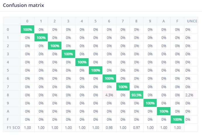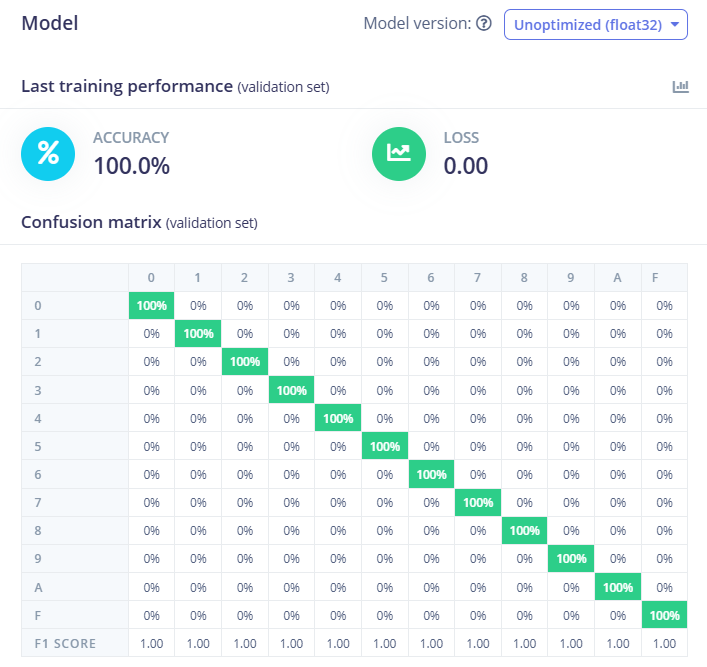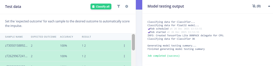 Sau khi quá trình huấn luyện hoàn tất, mô hình đạt được độ chính xác tối ưu 100% trên tập validation, như thể hiện trong hình bên dưới. Bên cạnh việc hiển thị các chỉ số đánh giá, Edge Impulse còn hỗ trợ thống kê chi tiết kết quả huấn luyện thông qua confusion matrix, giúp đánh giá mức độ chính xác của mô hình trên từng lớp dữ liệu. Ngoài ra, nền tảng này còn cho phép trực quan hóa các mẫu dữ liệu bị nhầm lẫn, giúp người dùng dễ dàng quan sát và phân tích nguyên nhân sai lệch, từ đó cải thiện chất lượng dữ liệu hoặc điều chỉnh mô hình nếu cần thiết.