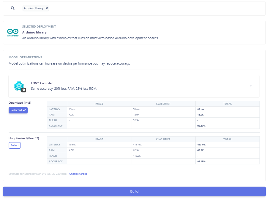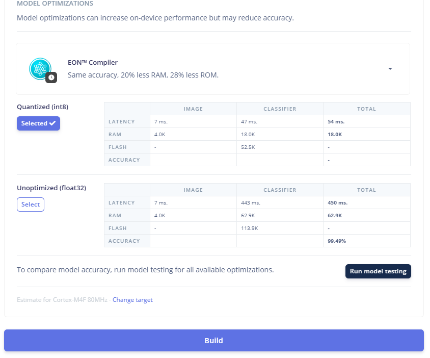 Edge Impulse còn hỗ trợ tối ưu hóa mô hình ở bước triển khai thông qua EON™ Compiler, giúp giảm khoảng 20% dung lượng RAM và 28% dung lượng ROM so với mô hình ban đầu. Sau khi huấn luyện, mô hình mặc định được tạo ở dạng float32, phù hợp cho các hệ thống có khả năng xử lý số thực tốt. Tuy nhiên, khi áp dụng kỹ thuật lượng tử hóa (Quantization) xuống INT8, độ trễ khi suy luận trên thiết bị giảm đáng kể, chỉ còn khoảng 54 ms, đồng thời mức sử dụng RAM và bộ nhớ Flash cũng giảm đi rõ rệt. Điều này đặc biệt hữu ích khi triển khai mô hình trên các vi xử lý hoặc vi điều khiển có tài nguyên hạn chế. Trong trường hợp các hệ thống nhúng có cấu hình cao hơn, người dùng vẫn có thể lựa chọn mô hình float32 để đảm bảo độ chính xác tối đa. Cần lưu ý rằng việc lượng tử hóa có thể ảnh hưởng nhẹ đến độ chính xác của mô hình, tuy nhiên trong project này, độ chính xác vẫn được giữ nguyên, cho thấy hiệu quả của quá trình tối ưu hóa.