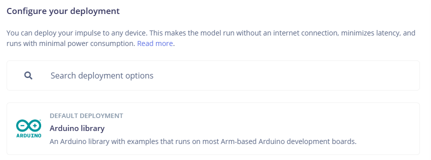 Ở bước Deployment, Edge Impulse cho phép xuất mô hình dưới dạng Arduino library (tùy chọn mặc định), giúp mô hình có thể chạy trực tiếp trên thiết bị nhúng mà không cần kết nối Internet. Ngoài Arduino, người dùng cũng có thể lựa chọn các hình thức triển khai khác bằng cách tìm kiếm trong mục Search deployment options, tùy theo nền tảng phần cứng đang sử dụng.