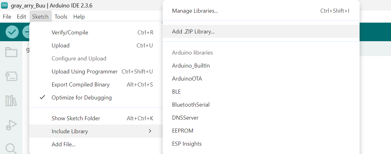 Trên thanh công cụ của phần Adruino IDE, vào Sketch -> Include Libray -> Add .ZIP Libray và sao đó chọn file model .ZIP đã được tải xuống từ Edge Impulse