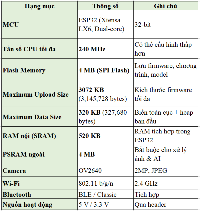 Bảng 1. Bảng thể hiện các thông số của ESP32 CAM