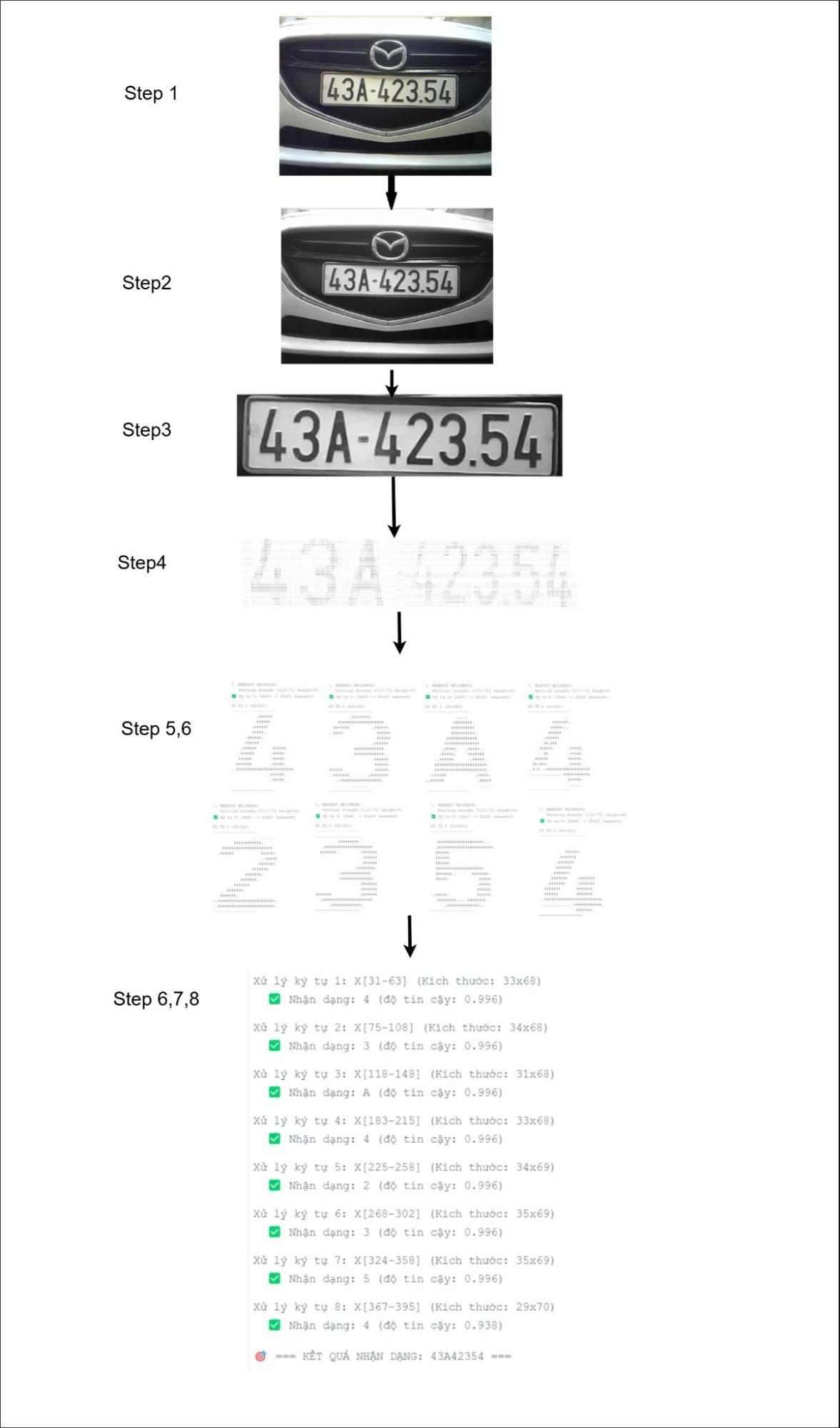 Tiếp theo, chúng tôi sử dụng Python kết hợp với thư viện xử lý ảnh OpenCV để thực hiện các bước tiền xử lý. Cụ thể, hệ thống tiến hành phát hiện và trích xuất vùng biển số xe từ ảnh gốc, sau đó tách từng ký tự riêng lẻ trên biển số. Mỗi ký tự sau khi được tách sẽ được xử lý để cải thiện chất lượng ảnh, bao gồm điều chỉnh độ sáng và độ tương phản, chuyển sang ảnh xám và chuẩn hóa kích thước về 28 × 28 pixel. Việc chuẩn hóa này giúp đảm bảo tính đồng nhất của dữ liệu đầu vào và phù hợp với yêu cầu của mô hình học máy.