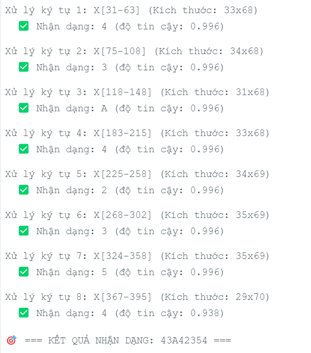 Sau bước resize, ta có 1 mảng lưu các kí tự đã resize ta tiến hành đưa lần lược chuẩn hóa từng phần tử kí tự này và đưa vào model để dự đoán. Và ta sẽ lưu kết quả dự đoán vào 1 mảng kí tự, và sao đó ghép chuỗi chúng lại để có 1 biển số hoàn chỉnh.