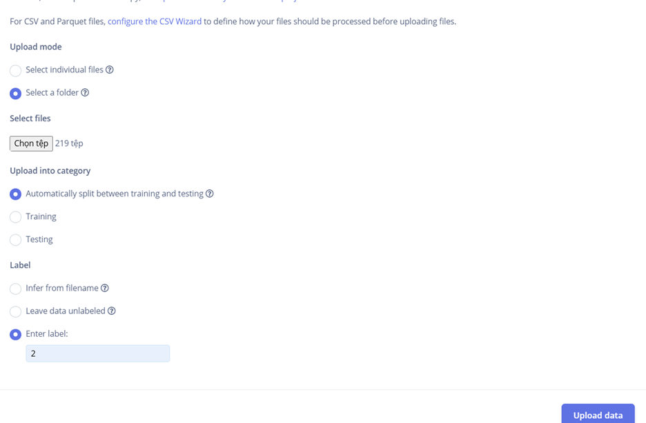 Để tăng tốc độ xử lý và tránh phải gán nhãn thủ công từng ảnh, nên sử dụng tùy chọn Enter label: nhập trực tiếp nhãn chung cho toàn bộ các ảnh trong đợt tải đó (ví dụ: nhập “2” nếu đang tải thư mục chứa tất cả ảnh ký tự số 2, hoặc nhập “A” cho thư mục chứa ký tự chữ A). Edge Impulse sẽ tự động gán nhãn này cho mọi ảnh trong thư mục, giúp quá trình chuẩn bị dữ liệu trở nên nhanh chóng và thuận tiện hơn rất nhiều. Lặp lại các bước này cho từng thư mục tương ứng với từng lớp ký tự cho đến khi toàn bộ dataset được tải lên hoàn chỉnh.